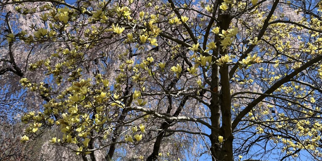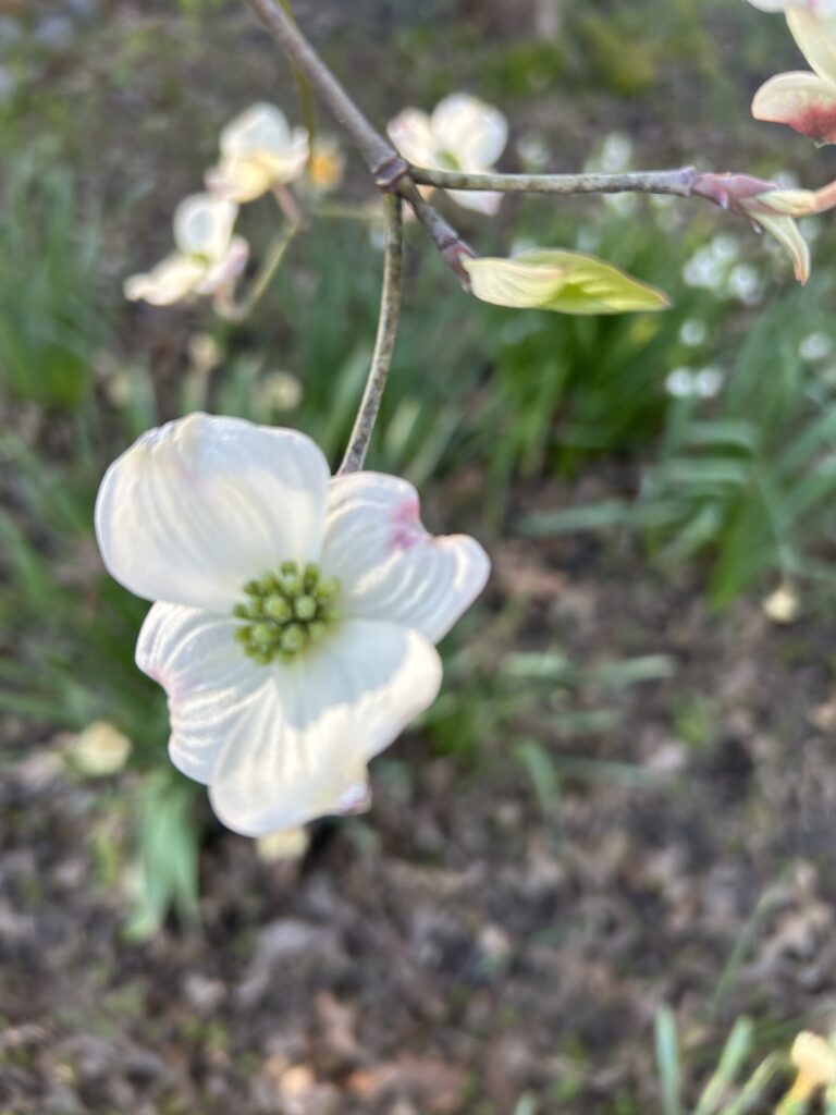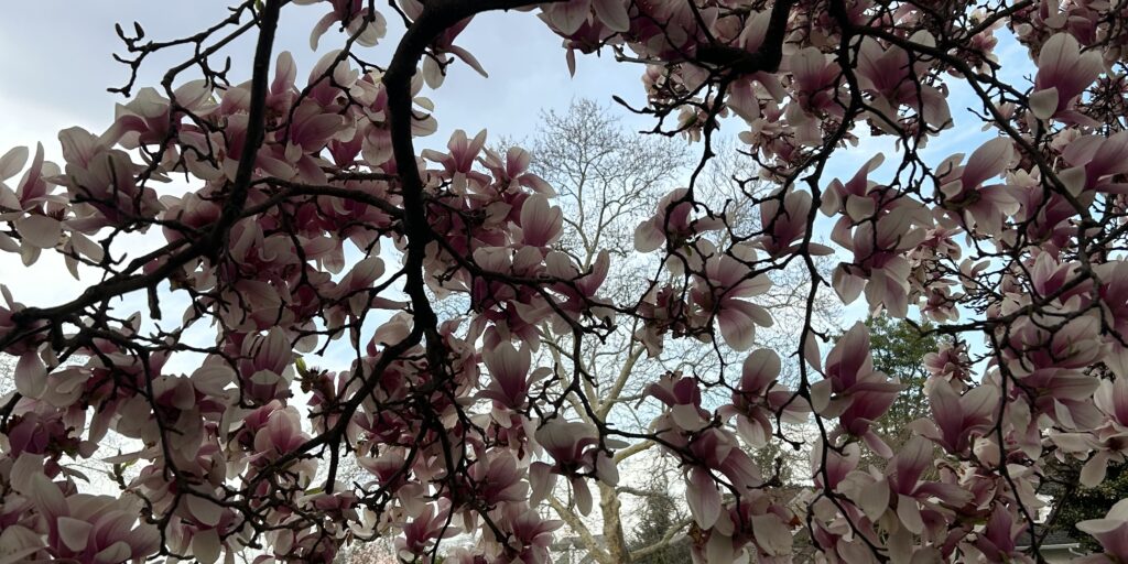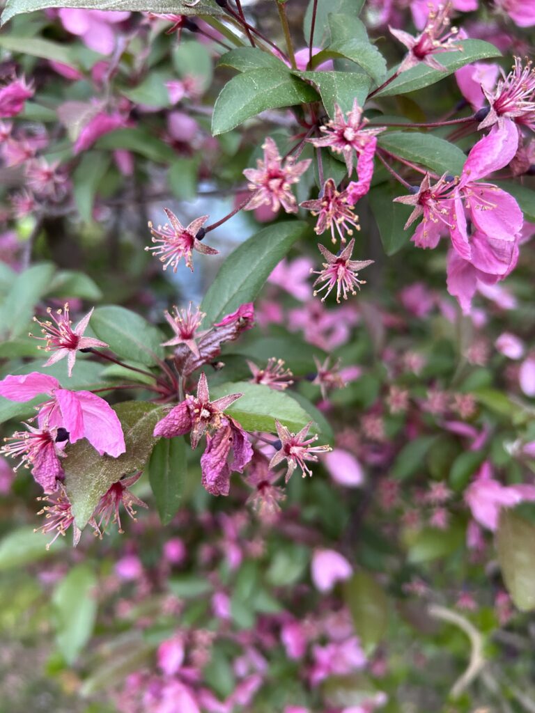 It is particularly evident in the crab apple tree where some of the flowers cling to the branches while others leave gaps in the empty spaces directly next to where they once were. On the ground below the blossoms sprinkle the broken sidewalk with glitter as the tree prepares to produce fruit. It reminds me of Oz.